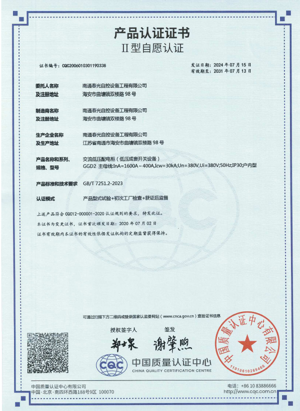 交流低壓配電柜認證證書